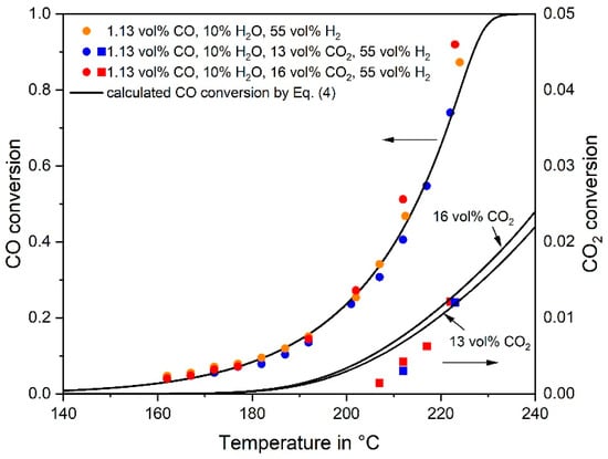 Influence of CO2 addition on the CO conversion and comparison of experimental data and kinetic model, Equations (4) and (6). The CO2 conversion is also indicated for experiments with CO2 addition (1.13 vol% CO, 10% H2O, 55% H2, 0–18% CO2, rest N2, mcat = 2 g, p = 1 bar, τ(190 °C) = 260 kg s·m−3). The equation describing the CO2 methanation, which was used here to calculate the CO2 conversion is introduced in Section 3.2.