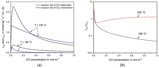 (a) Calculated initial CO and CO2 reaction rates (Equations (4) and (6)) and (b) ratios for different CO concentrations (20% CO2, 55% H2 in N2, mcat = 2 g, (190 °C) = 413 kg·s·m−3, (230 °C) = 380 kg·s·m−3, 1 bar).