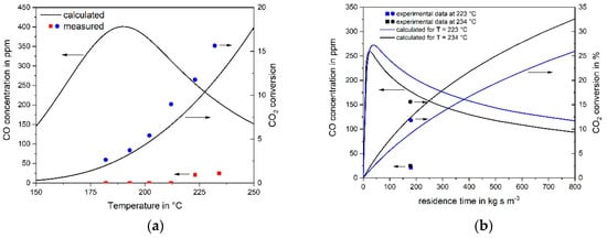 Approach 2: If the hypothesis would be correct that CO2 methanation is just an indirect reaction and only occurs via RWGS and subsequent CO methanation, then the measured reaction rate of CO2 should only reflect the rate of RWGS. The concentration of the intermediate CO during the conversion of CO2 with H2 can then be calculated based on the CO and CO2 reaction rates as determined in this work, Equation (4) and Equation (6). Figure 5a,b show the results both of the calculation and of two experiments for a feed gas with 6 vol% CO2 and 55% H2 (rest N2), if either the temperature (140–252 °C) or the residence time (for 223 °C and 234 °C) is increased. The calculated volumetric content of the “intermediate” CO can now be compared with experimental data: The calculation leads to relative high values of the CO content of up to 400 ppm, although no CO was experimentally detected for T < 200 °C. Even for 223 °C and 9% CO2 conversion (12% measured), the simulation leads to 240 ppm CO, whereas the experimental value is only 20 ppm. For 234 °C, XCO2,calculated is 12% (still in acceptable agreement with 16% measured) and 190 ppm CO are calculated compared to the experimental value of 25 ppm CO. These results again lead to the conclusion that the indirect pathway of CO2 methanation is not or only to a very low extent taking place, and that CO2 is directly hydrogenated to CH4 on the used Ru catalyst.