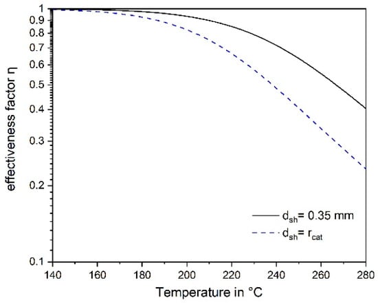 A pore diffusion resistance lead to internal concentration gradients and a lower effective rate compared to the intrinsic chemical rate; this has to be considered in the rate equation [32]. For this purpose, the generalized Thiele modulus Φgen for an irreversible reaction with arbitrary kinetics (here Langmuir–Hinshelwood approach, Equation (4)), was used [33]: