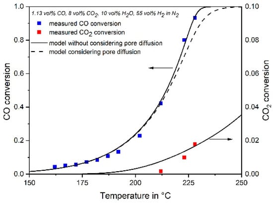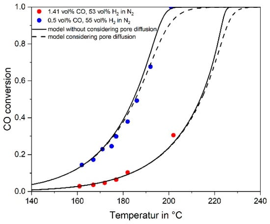 Hence in the following, the effect of pore diffusion was considered. Figure 8 shows measured and modelled values of the conversion of CO (numerical integration of Equation (4)) including influence of pore diffusion) for two different feed gases with 1.41 and 0.5 vol% CO and 55 vol% H2 in N2. For the given temperatures of below 200 °C, the conversion and reaction rates are almost unaffected by pore diffusion (see also Figure 7), and therefore not really reflected by the experimental data.