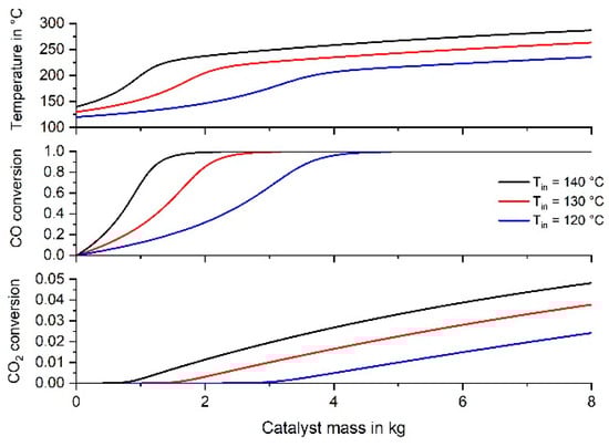 The Viessmann company (Germany) sales fuel cell appliances for one- or two-family households for production of electrical power and heat. For example, the model “Vitovalor PT2” has a fuel cell with an electric power of 0.75 kWel and a heat power of 1.1 kWth [35]. The corresponding H2 flow rate for a typical overall efficiency of 80% can then be estimated based on the lower heating value of H2 (10.78 MJ·m−3). The resulting flow rate is 772 L H2 h−1, which corresponds to a total flow rate of 971 l h−1 for a reformate consisting of 0.5% CO, 10% CO2, 10% H2O, and 79.5% H2. In Figure 10 and Table 4, the results of the simulations are given for different gas inlet temperatures. The RWGS reaction, which may play a role at temperatures above 240 °C, was not taken into consideration.