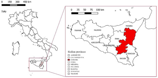 Data gathered from the 2010 Agricultural Census highlighted that approximately half (46%) of Italian citrus farms are located in Sicily whereas the other regions have no more than 8%, except for Calabria at 26% [55,56]. In detail, there are about 79,500 citrus farms in Italy, which are mostly located in Sicily and Calabria. In Sicily, the province of Catania and Syracuse are the provinces with the highest concentration of citrus production [28].