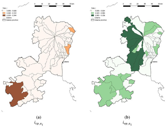 Territorial distribution of the index (a) and index (b) in the municipalities of Catania province.