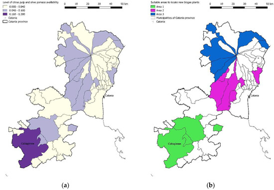 (a) Territorial distribution of the combined levels of citrus pulp and olive pomace availabilities. (b) Areas suitable to locate cooperative biogas plants.