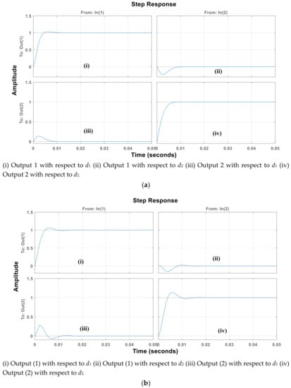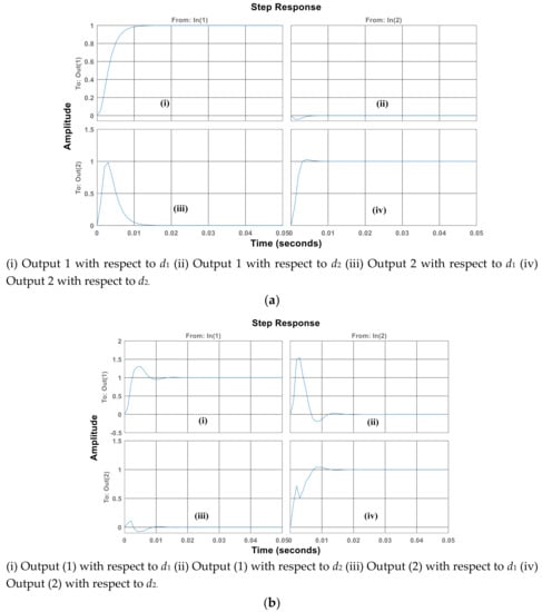 The response of the unit step function for the controllers taken into study using MATLAB® m-file coding is shown in Figure 11a,b for SIDO and DIDO, respectively.