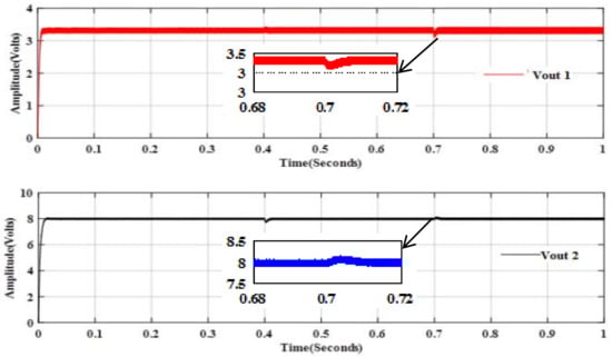 Similarly, for DIDO converters, load disturbance is given at t = 0.4 s in output 2 by increasing the current from 2 A to 2.5 A and the output 1 takes 0.017 s to come back to the value of 3.3 Volts. The output 2 has undershoot and takes 0.032 s to come back to the value of 8 V. Load disturbance is given at t = 0.7 s in output 1 by increasing the current from 2 A to 2.5 A and the output 2 takes 0.02 s to return to the value of 8 V. The output 1 has undershoot and takes 0.03 s to return to the same value.