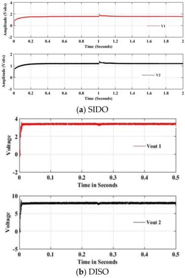 Figure 11a,b reveal that both the output voltages obey only for their respective control inputs due to the addition of Optimal LQR controller and the outputs are zero due to other inputs. The converters and the optimal LQR controller are developed using discrete components available in MATLAB SIMULINK®. The results are shown in Figure 12 for the SIDO converter and in Figure 13 for the DIDO converter.