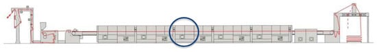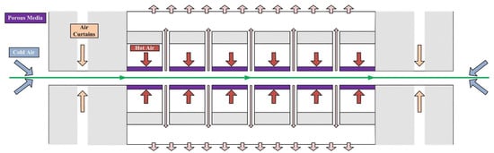 A feature of the stenter machine is keeping the pressure into the drying chamber below the ambient value. This condition is ensured by the exhaust fans, and it is required to prevent the leakage of combustion gases and effluents from the drying chamber. Indeed, if the combustion gases and the effluents of the drying process get out of the machine, they may cause serious human health issues, besides environmental pollution. However, as the stenter working chamber operates below the atmospheric pressure, cold air is ingested from both the inlet and outlet slots of the machine, with a relative fraction of the total mass flow between 3% and 7% [12,13,14,15]. Ingestion of cold air decreases the machine efficiency and the effectiveness of the drying process. Therefore, to improve the stenter operation, cold airflow from the surrounding environment into the machine should be minimized. From the process point of view, this also improves the quality of the manufactured fabric, as the ingested air may contain dust and other contaminants. The proposed solution to this issue is the use of air curtains at both machine inlet and outlet, as displayed in Figure 3.