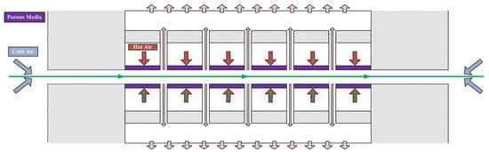 A porous media assumption was utilized to model the nozzle arrays through which the hot air reaches the main air-drying zone. The geometric parameters of the blowing boxes were selected to model the perforated plates as generally as possible (Table 2).