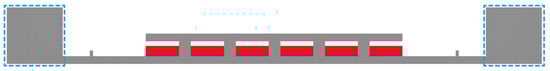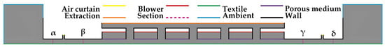 The model for the CFD analyses was generated considering the two-dimensional longitudinal section of a single stenter module. Since the machine is vertically symmetrical relative to the textile, only the upper half of the geometry was created to reduce the use of computational resources and speed up calculations. Three cell zones were defined, as shown in Figure 4 where the main fluid domain, the porous media and the blowing arrays are respectively represented in grey, violet and red. The latter two zones represent the internal recirculation circuit of the machine, while the main fluid domain covers both internal recirculation and the external air. Indeed, a correct fluid domain definition requires that representative portions of the ambient air section both upstream and downstream of the stenter inlet and outlet, as well as the air inside the machine, are considered. The external air regions (dashed light blue line) were sized during preliminary analyses with the aim of modelling the ambient region, which is perturbed by the air flow induced by the machine.