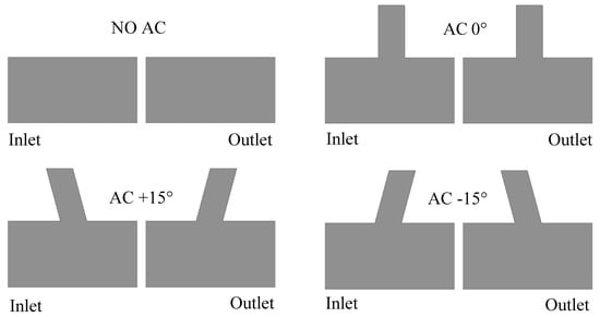 Regarding the geometry, the investigated stenter configurations are four (Figure 5) and vary based on the absence or the presence of the air curtains and on their tilt angle (−15°, 0° and +15°). The tilt angle represents the inclination of the air curtain duct relative to the vertical axis: it is defined positive when the air flow is oriented inward to the machine and negative when the AC is pointing outwards. Indeed, the sign convention for tilt angle, as for all the variables, is that quantities entering the system are considered positive. The aspect ratio of the ACs, defined as the ratio between the width of the AC passage and the gap to be sealed, is 2.5.