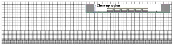 The spatial discretization method utilized in the numerical setup is the finite volume with cell-centered approach. A mapped mesh with quadrilateral elements was generated to discretize the stenter schematic geometry. To assess computational grid independency, a mesh sensitivity analysis was conducted by comparing the results of several diverse meshes with number of elements ranging from 50,000 to 1 million. Since the mesh sensitivity analysis showed a relevant influence of cell dimensions around the fabric, an element refinement in its proximity was done for each grid. The final grid was defined as a compromise between accuracy and computational time: the selected mesh with 260,000 elements fulfils the fixed net mass flux accuracy criterion of 10−10 with respect to the specific total mass flux of 0.06185 . In Figure 6, a close-up of the mapped grid at domain inlet highlighting element structure and distribution is represented.