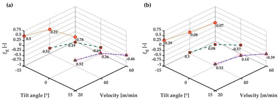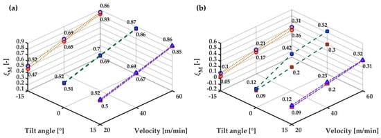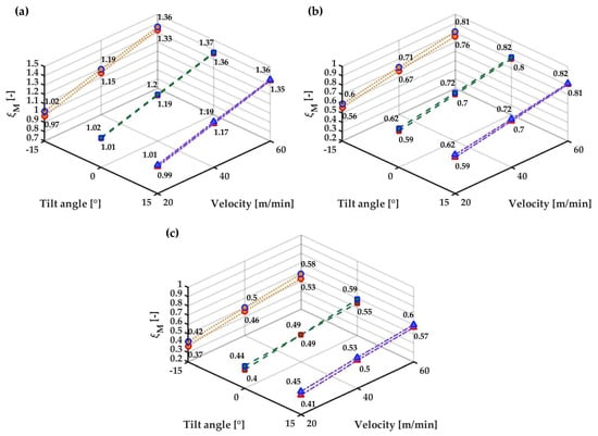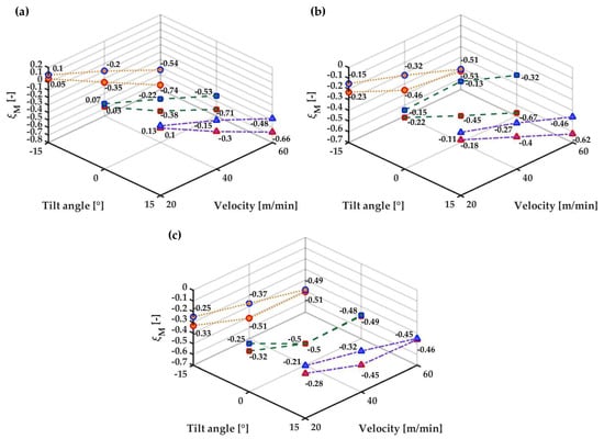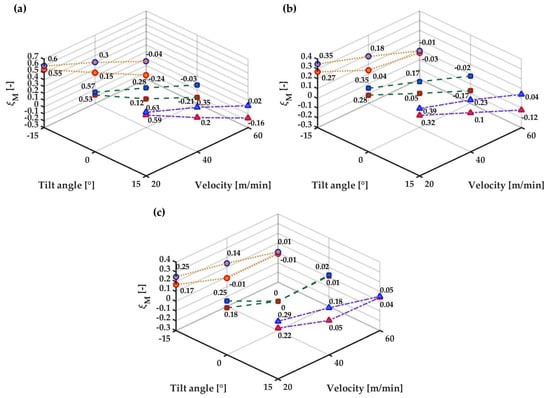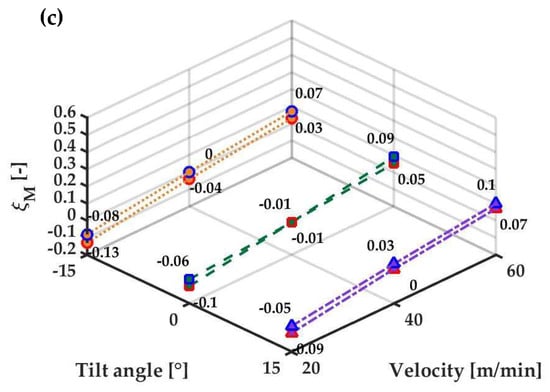 The tilt angle configurations are presented in orange (−15°, dotted line), green (0°, dashed line) and violet (+15°, dash-dotted line), with blue pointers for an AC temperature of 15 °C and red pointers for 70°C. In Figure 8 the control section α is considered and it is noticeable that an increase of mass flow rate from 3% to 5% corresponds to a global decrease of ξM for each fabric speed; a further increase of AC mass flow rate (up to 7%) reduces furtherly the ξM value, but a limited amount of flow leakage across the machine inlet section at the lowest fabric speed appears (negative ξM values). The results obtained for the section β (Figure 9) are a consequence of this behavior and indicate that for the highest mass flow rate, with fabric moving at 20 m/min, the air curtain flow is partially directed outside of the stenter, while for all the other configurations it is moved towards into the machine.