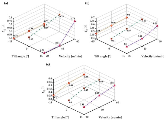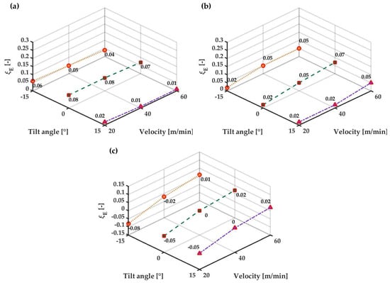 Figure 12 shows that the use of warm air at machine inlet is beneficial for increasing the heat recovery inside of the stenter. In cases (a) and (b) with 3% and 5% of AC mass flow, respectively, the entire mass flow rate of the air curtains is ingested by the machine for each fabric speed, with positive effects on the effectiveness of heat recovery. This means that higher values of this parameter are observed for the increasing values of the fabric velocity. For the case (c) with 7% of AC mass flow rate, a positive value of ξE is obtained only at the highest fabric speed, while for lower velocities ξE is negative due to partial leakage of the AC mass flow rate.