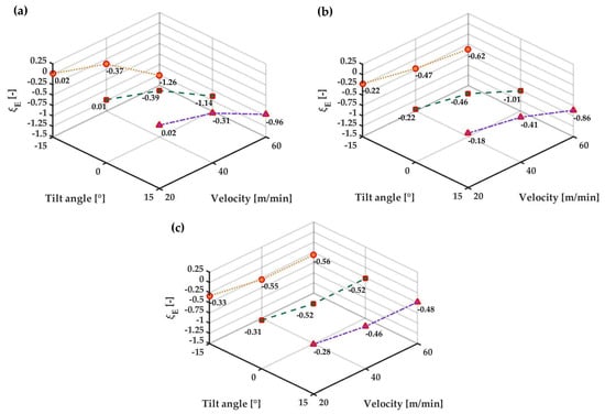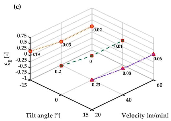 In Figure 13, it is noticeable that the tilt angle of the air curtains influences the energy effectiveness. The highest values of the ξE are obtained with zero tilt angle air curtains. Nonetheless, that influence is reduced at higher fabric speed and higher AC mass flow rate. At the machine outlet, on section γ (Figure 14), it is evident that the warm air of the air curtains is not correctly recovered. In fact, in most of the cases the ξE value is close to 0 or lower when the textile velocity is medium or high, while a positive outcome is visible for low AC flow rates at low fabric velocity. The energy effectiveness coefficients at section δ in Figure 15 confirm this trend with even lower values, thus demonstrating that the heated air is wasted at the machine outlet due to the action of the moving fabric. This clearly indicates that, for the outlet sections, air curtains at ambient temperature, or even the absence of ACs, could be preferred, as the heat recovered would be dispersed in the surrounding environment. The data state that a configuration with air curtains with tilt angles 0° or +15° and warm jets (70 °C) and a mass flow rate equal to the mass flow rate that would be ingested from the surroundings without these devices, provides the best effects. However, at the highest fabric velocity analyzed, a cold air curtain at machine outlet has better parameters. For this reason and to assess the possibility of a reduction of regenerative heat demand, even a mixed configuration with a warm inlet AC (70°C) and a cold outlet AC (15 °C) was analyzed. Since tilted air curtains would imply higher manufacturing complexities than vertical orientation, without significant improvements, only null tilt angles were considered.
