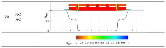 Figure 16 illustrates the symmetrical distribution of ηAW for the reference configuration without air curtains when fabric is steady. In this reference case, the negative influence of cold air entrance is clearly visible, as part of the ambient flow is mixed with the warm air from the blowers. The comparison between the reference case without air curtains at 20 m/min fabric speed and the two best configurations with ACs (Figure 17) shows the beneficial impact of these devices. At stenter inlet, the presence of a warm air curtain determines a negligible variation of the ηAW field, but its value on the fabric results to be lower (from 0.55 to 0.45), thus demonstrating that in this case the AC flow substitutes the ambient flow, ensuring a good sealing efficiency.