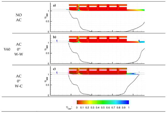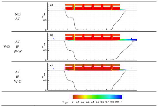 In Figure 19, the worst scenario is represented. In the absence of air curtains (a), it is clearly visible that the fabric is subject to a low ηAW value for a great portion of the machine due to a strong entrainment. Although that configuration could be of interest for the fabric warming, a significant amount of hot air exits from the outlet opening and the energy efficiency is greatly reduced. The use of a double-warm air curtain configuration (b) allows for a slight decrease of the ηAW values near the stenter outlet (also on the fabric) but the warm flow from the AC is still wasted, as the flow is almost completely entrained towards the exit section. The configuration with the mixed warm-cold air curtains (c) reduces the portion of fabric that is subject to high temperatures, but at the same time is preferable for its higher sealing efficiency (also indicated by the mass sealing effectiveness coefficient closer to zero at control section γ shown in Figure 14) and for its increased thermal efficiency, as there is no waste of energy towards the ambient.