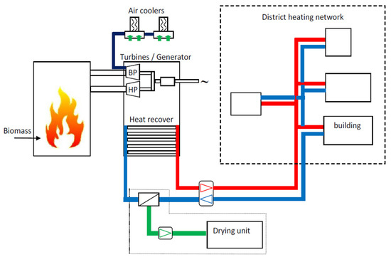 A current challenge is to identify new market applications for this energy [11,12]. Indeed, the efficient use of heat at low temperatures is limited to a few applications such as power generation from ORC [13,14], which has poor efficiency at low temperatures, heating of horticultural greenhouses [12], preheating steps in industrial processes [15,16], and heat supply for anaerobic digestion of biomass [17]. Due to the geographical location of the power units (i.e., generally close to residential buildings and municipal infrastructures, integrated to district heating networks), it is seldom possible to develop such “unavoidable” heat waste recovery systems. Several studies have a major aim to evaluate the potential of process sites for low-grade heat recovery, especially the efficiency of various options (e.g., ORC, Kalina cycles, adsorption heat pumps, chillers, etc.) [18]. The optimization of cogeneration systems was also numerically studied [19]. Other works focused on specific techniques to recover heat waste. For example, the use of heat pumps operating in various production sites [20] or the implementation of chemisorption-based energy storage systems [21]. As the domestic demand of heat fluctuates as a function of the weather, the temperature of the return flow, and consequently the availability of heat waste in the heating network, will be variable [22]. One possible alternative way to use this low-grade heat is by pre-drying or drying wet materials, such as fuel pre-drying [16,23], sewage sludge drying (including heat from the biochemical process treatment [24]), and biomass drying for energy purposes [17,25,26,27]. Indeed, woody biomass coming from forestry contains up to 50% in water weight and its combustion is consequently energetically unattractive. By eliminating around 20% of the initial water, the heat capacity increases from 2.2 to 3.9 kWh·kg−1. In this way, the dried biomass can be stored (if protected to avoid further moisture absorption) and used as fuel with higher heat capacity [28].