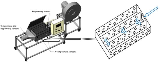 The pilot dryer [31] consisted of a small-scale reproduction (1/10th scale model) of the industrial dryer (Réseaux de Chaleur Urbains d’Alsace company). The ambient air was drawn by a fan, heated by electrical heaters, and then introduced in the drying chamber. Air velocity, temperature, and humidity WERE directly measured USING sensors connected to a control panel. The biomass was then placed into the drying chamber, in which it was composed of two parallel beds. The drying chamber, containing the biomass, was then placed on a balance, able to continuously measure the mass loss, and indirectly the humidity content. Four supplementary thermocouples allowed for temperature measurement inside the biomass beds. Further, one thermocouple and a sensor were placed at the exit of the dryer to measure the temperature and humidity of the exhaust air. All experimental data were recorded in real time with a data acquisition system integrated into the control panel.