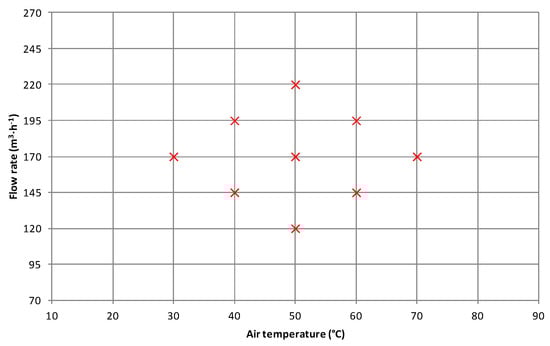 Experiments were performed according to the Design of Experiments (DOE) (central composite design), as shown in Figure 3. This approach allowed us to optimize the utilization of experimental and numerical results [40]. On the basis of the DOE, the studied functions Y can be approximated by the quadratic function of air temperature and flow rate, reported as follows: