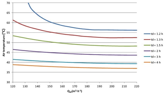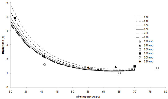 Figure 5 shows the isocontours of the drying time in a diagram, where the air temperature is plotted as a function of the air flow rate (obtained by the DOE equation). To satisfactorily approximate the drying time (minimization of errors between experimental and calculated values), a polynomial equation was applied with the logarithm of the drying time.