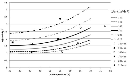 Figure 6 shows the energy consumption for the wood chips drying process (expressed per kilogram of evaporated water) as a function of the operation conditions (air temperature and flow rate). The numerical approximation of the energy used was performed by studying the square root of Q.