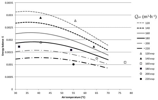 Figure 7 reports the energy balance as a function of air temperature at different operating conditions (various air flow rates). The numerical approximation of the energy balance was carried out by studying the logarithm of E. Taking into account only the energy capacity of biomass combustion, it turned out to be more interesting to dry at a low air temperature and low flow rate. The rapider the drying, the lower the drying efficiency. As previously observed, the optimal conditions of drying, in terms of time (Figure 4, T ≥ 50 °C), energy balance (Figure 6, 30 ≤ T ≤ 55 °C, Q minimal), and energy consumption (Figure 5, 30 ≤ T ≤ 50 °C, Q ≈ 120 m3·h−1), were reached for low air flow rates (i.e., 120–140 m3·h−1) and intermediate temperatures (T ≈ 50 °C).