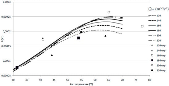 The best drying conditions in terms of time (high temperature T > 50 °C and Qair > 170 m3·h−1) corresponded to the highest energy consumption. On the contrary, the lowest energy consumptions were reached for low air flows Qair < 160 m3·h−1 and T < 60 °C. These two functions present opposite behavior. The best (drying time and energy consumption) ratio could be reached at intermediate flow rates (in the 160–170 m3·h−1 range) and intermediate temperatures (between 50 and 60 °C).