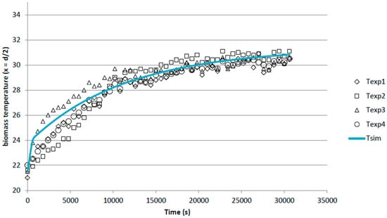 The model used in this study was a classic drying model already accurately detailed in the literature [32,33,34]. Mass and heat transfer were assumed to be monodimensional (x) and time dependent (t) in the biomass bed [35]. Hence, the drying process was described using a set of three coupled and non-linear differential equations (Equations (1)–(3)), representing the water mass balance (Equation (1)) and the energy balances in air (Equation (2)), as well as the biomass (Equation (3)), respectively. An additional equation was used to approximate the drying kinetics (Equation (4)).