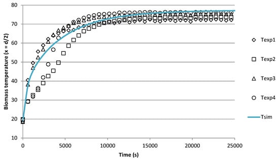 The model consisted of four equations and associated boundary conditions with four unknown factors (H, M, T, and θ). This system was spatially discretized according to the finite difference method and the Euler method, used for time integration. The different thermo-physical properties of air and biomass were calculated as a function of temperature and water content. Simulations were performed according to an explicit scheme, which previously required an adjustment of the discretization parameters.