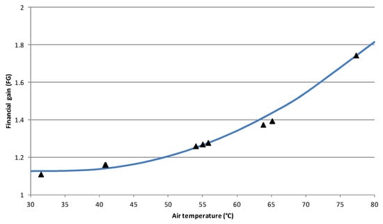 Experiments were performed accordingly to the central composite design. The operating conditions in terms of air temperature and air mass flow rate are shown in Figure 3. Table 1 shows the results obtained for the 10 experimental tests in terms of drying time, heat used for drying, energy balance, and financial gain (projection on a real cogeneration installation).