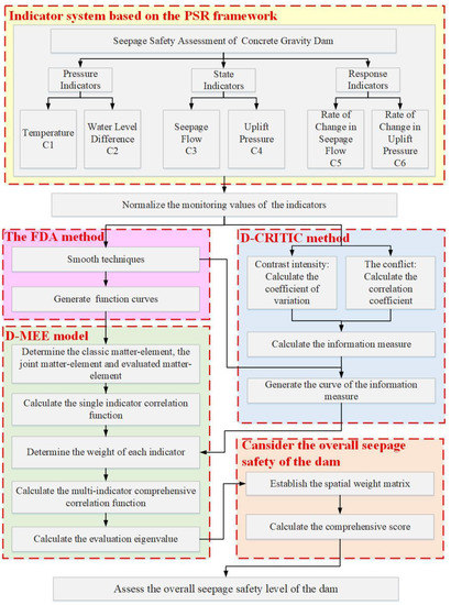 The process of developing the proposed methodology (Figure 2) begins by establishing an indicator system based on the pressure–state–response (PSR) framework. Then, in order to avoid the inconvenience caused by the difference in the value range and units of the indicators, the monitoring values of each indicator are normalized. In subsequent steps, the smoothing technique of the FDA method is used to convert the discrete values of each indicator into a continuous function curve. A dynamic matter-element extension (D-MEE) model is established by replacing the discrete values in the traditional matter-element extension model with the generated continuous function curve. In this evaluation model, in order to consider the correlation among the indicators, the indicator weights are determined by the D-CRITIC method, which is established by combining the FDA method and CRITIC method. Furthermore, in order to consider the influence of the seepage safety status of different dam blocks on the overall seepage safety of the dam, the evaluation eigenvalues of each dam block are introduced into the construction of the spatial weight matrix, and the comprehensive score of the dam’s overall seepage safety assessment is calculated. Eventually, the overall seepage safety level of the dam can be judged based on the comprehensive score and related grading standards.