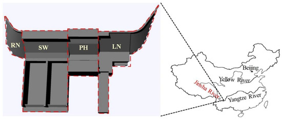 In order to consider the influence of the different dam blocks on the overall seepage safety status, the concrete gravity dam X is roughly divided into four parts according to the blocks’ different roles played in the dam operation: the left nonspillway (LN) dam block for retaining water on the left bank, the right nonspillway (RN) dam block for retaining water on the right bank, the powerhouse (PH) dam block for power generation, and the spillway (SW) dam block for flood discharge in the middle of the riverbed. The regional map of concrete gravity dam X and the 3D dam model are shown in Figure 3. According to the geological exploration data, the left bank foundation of concrete gravity dam X is squeezed with compressive zone [8], the low strength and high permeability of rock mass poses a threat to seepage safety. In addition, the rock mass in the compressional zone has a small inclination, which is easy to form a slip control surface and is very unfavorable to the anti-sliding stability of the dam. Therefore, the LN dam block was chosen for implementing the method in detail.
