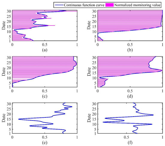 The monitoring values of the indicators in October 2012 are provided by the automated seepage safety monitoring system, the seepage flow data on 3 and 9 October of the LN dam block are missing. Because the evaluation indicators proposed in this study are the reverse indicators, the smaller the indicator value, the safer the evaluation result. Therefore, Formula (4) was used to normalize the monitoring data of the indicators. Then, the fourth order B-spline basis function is used to smooth the data of each indicator because the monitoring data selected in this paper is nonperiodic and inevitably have monitoring errors. At last, the discrete data are converted into a continuous function curve over the same time domain according to the Equations (1) and (2), although the monitoring values of seepage flow on the 3 and 9 October are missing, as shown in Figure 4. The rate of change in seepage flow and the rate of change in uplift pressure are obtained by the derivative analysis of the FDA method, as shown in Figure 4e,f.