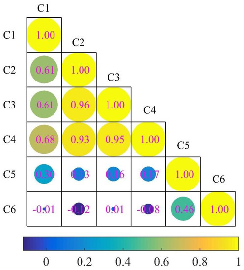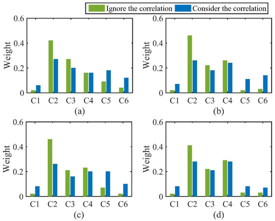As shown in Figure 9, in the case of ignoring the correlation among indicators, the comprehensive score will be greater than that when considering the correlation among indicators. Because the indicator weight has a crucial impact on the evaluation results, this study calculates the average weight of each evaluation indicator of each dam block under these two conditions, as shown in Figure 10. It can be seen in Figure 10 that the weights of key indicators C2, C3, and C4 will increase significantly in the case of ignoring the correlation among indicators, which means that the conflict among C2, C3, and C4 is large, reflecting that their information similarity is small. However, according to the correlation analysis of Figure 5, the correlation coefficient among C2, C3, and C4 is greater than 0.9, which is a strong correlation; that is, the information similarity reflected by C2, C3, and C4 is large. Therefore, it is necessary to consider the correlation among indicators in the calculation of indicator weights.