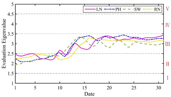 The results of the D-MEE method are highly consistent with the results of the other methods. As seen in the results, the evaluation results on 6, 7, 8, and 12 October are identical. In addition, the results of the D-MEE method are close to those of other methods. That is, 90% of results are the same as those from the matter-element extension method, and 70% of the results are the same as those of the fuzzy comprehensive evaluation method and the set pair analysis method.