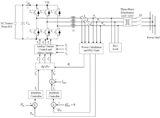 In this study, a DC/AC inverter with DC power supply is adopted to emulate a DG system for the islanding detection and the tracking control of active and reactive power outputs. The three-phase inverter-based DG system is connected to the power grid with a RLC load [,] for islanding detection. Moreover, a novel active islanding method by injecting a perturbation signal, which is designed as the difference of frequency, into the d-axis current of the inverter-based DG system is proposed in this study. The d-axis current is adopted to control the reactive power output of the inverter-based DG system. When the inverter-based DG system is connected to the power grid, the injected perturbation signal will be close to zero. Hence, the injected perturbation signal will have no impact on the power quality and the inverter-based DG system. When the power grid breaks down, the perturbation of frequency will result in a rapid increase of the frequency difference, hence, it can accelerate the frequency to drift beyond the NDZ to achieve the purpose of islanding detection. Furthermore, for the purpose of improving the transient and steady-state responses of the active and reactive power outputs of the DG system and decreasing the detection time of the islanding phenomenon, the PFNN controllers proposed in [,] are adopted to take the place of the traditional PI controllers in this study. First, the structure of the inverter-based DG system will be illustrated in Section 2. The NDZ and the proposed active islanding method will be derived in Section 3. In addition, the network structure and online training algorithm using backpropagation (BP) of the adopted PFNN will be discussed in Section 4. Then, the integration of the proposed active islanding method and the adopted PFNN controller will be described in detail in Section 5. Additionally, the experimental results are provided to verify the feasibility and effectiveness of the proposed active islanding method with the adopted PFNN controller in Section 6. Finally, some conclusions are given in Section 7.