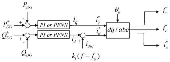 According to (3) and (4), the active power and reactive power are proportional to and control currents respectively. By using the active and reactive power errors as inputs, the control currents and can be obtained by the PI or PFNN controllers as shown in Figure 1. Moreover, the injected perturbation signal is added to the control current for the islanding detection to generate the d-axis current command and the control current is equivalent to the q-axis current command . Final, the three-phase current commands are computed through coordinate transformation and sent to the analog current control and drive circuits for generating the pulse width modulation (PWM) switching signals of the insulated gate bipolar transistors (IGBTs).