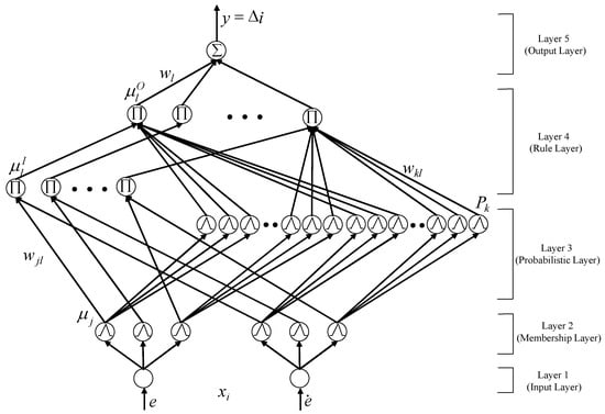The network structure of the adopted PFNN is represented in Figure 4 [,,]. The PFNN control owns five layers including the input layer, the membership layer, the probabilistic layer, the rule layer, and the output layer with two inputs and one output. Moreover, the basic function of each layer and the signal propagation are presented in the following: