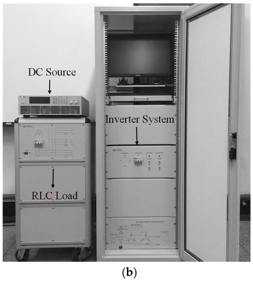 The block diagram of 2 kW voltage source inverter (VSI) of DG system and the photos of the laboratory setups for the tracking control and islanding detection are shown in Figure 5. The block diagram of the personal computer (PC)-based control computer is provided in Figure 5a. The switch S1 represents the circuit breaker and a DC power supply with 2 kW 200V 10 A is adopted to emulate the DC source of a DG. The parallel 2 kW RLC load is regarded as a local load and the resonant frequency is designed to be 60 ± 0.1 Hz in accordance with the UL 1741 standard [] for the islanding detection. The values of the parallel 2 kW RLC load are designed to be R = 6.05 , L = 6.42 mH and C = 1096 μF respectively. The output inductors L of the inverter are 10 mH and the DC-link capacitor is 3360 μF. Moreover, when the frequency of the power grid is 60 Hz, the RLC load is considered as a resistive load. If the power grid breaks down and the demanded power energy of the RLC load is fully supplied by the inverter-based DG system, without the efficacious islanding detection method, the frequency and output voltage of the inverter-based DG system will be retained as same as the power grid resulting in the islanding phenomenon. Thus, the designed test system can be implemented to verify if the islanding detection method is efficacious. Furthermore, the control algorithms, including the PFNN control, the PLL and the proposed active islanding detection method, are carried out by the Matlab & Simulink Real-Time Control package with 0.5 ms sampling time. Then, in order to implement the active and reactive power outputs of the inverter-based DG system and to detect the islanding phenomenon, the three-phase output voltages and the three-phase inverter currents are obtained by the sensor circuits and sent to the PC through the PCI-1716 analog/digital (A/D) control card. The generated current commands are sent to the analog current control and drive circuits via PCI-1723 digital/analog (D/A) converter. Thus, the PWM switching signals of IGBTs for the tracking control and the islanding detection can be gained. Additionally, the photos of the laboratory setups are provided in Figure 5b.