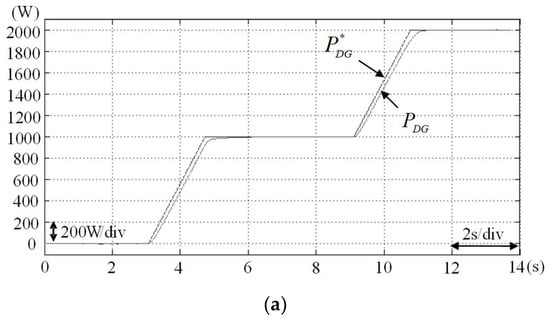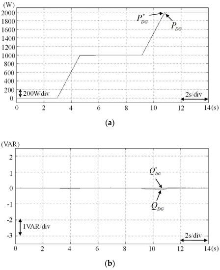 First, the experimental results of the inverter-based DG system using the PI controllers for the tracking control of the active power and reactive power outputs are provided to demonstrate the tracking performance of the system with the injected perturbation signal idist. In this study, the gains of the PI controllers are obtained by trial and error in order to achieve good transient and steady-state control performance. The resulted gains are kP = 2 and kI = 0.5, respectively. The experimental result of the inverter-based DG system using the PI controllers for active power command from 0 kW to 1 kW, 1 kW to 2 kW and reactive power command set to be 0 Var is provided in Figure 6. The responses of the active power output and active power command and the reactive power output and reactive power command are shown in Figure 6a,b, respectively. From the experimental result, the steady- state responses of the active power output at 1 kW and 2 kW can achieve the tracking effectiveness as shown in Figure 6a. However, for the transient responses, since the traditional PI controllers are not robust in coping with the system uncertainties such as parameter variations and external disturbances, the transient responses of the active power output from 0 kW to 1 kW and 1 kW to 2 kW are poor. Moreover, the transient response of the reactive power output will also be seriously affected as shown in Figure 6b.