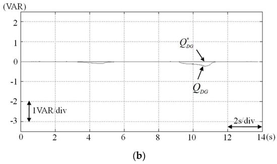 Experimental result of DG using PI controllers for active and reactive power control: (a) Response of active power; (b) Response of reactive power.