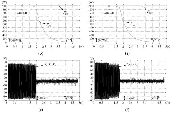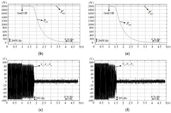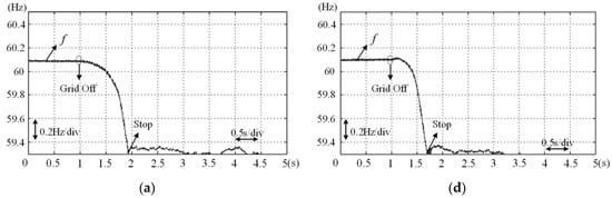 After 1.8 s, the injected perturbation signal idist is large enough to drift the frequency to deviate from the IEEE 1547 scope (59.3–60.5 Hz). In Figure 8b–c, the total time for the inverter-based DG system stops dispatching the generated power is about 0.8 s which meets the IEEE 1547 regulations within 2 s. On the other hand, when the proposed active islanding detection method adopts the proposed PFNN controllers, the islanding phenomenon can be detected immediately in 0.45 s as shown in Figure 8d. Compared to the experimental results of the proposed active islanding detection method using the traditional PI controllers operated at case 1 shown in Figure 8a–c, due to the advantages of the adopted PFNN controllers such as online learning and fast convergence, the responses of the proposed active islanding detection method using the adopted PFNN controllers can rapidly detect the islanding phenomenon shown in Figure 8d–f.