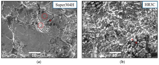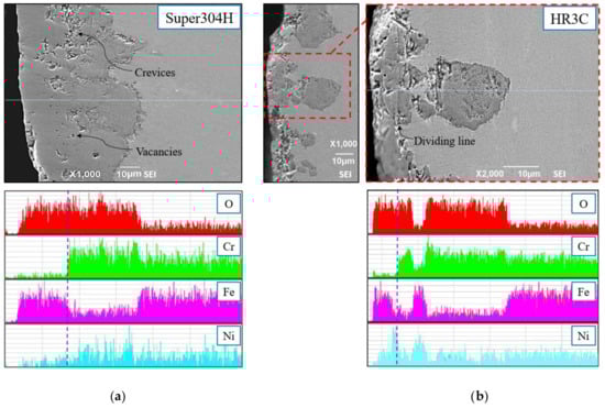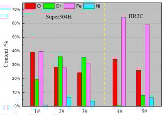- As the results of SEM and EDS, the oxidation layer of the Super 304H sample was thick and continuous while the oxidation layer of the HR3C was thin and unevenly distributed. Furthermore, the oxidation products of the two materials could be divided into two layers, the outer layer enriched in O element and Fe element, and the inner layer enriched in O element and Cr element.