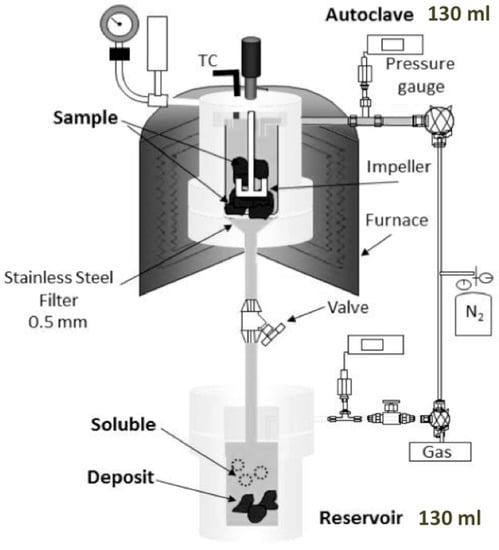 Batch extractions were performed at 200, 250, 300, and 350 °C for 0 min, and at 350 °C for 60 min. When the furnace reached the desired temperature, it was stopped, and the connecting valve was opened immediately, allowing the extracted products into the reservoir. The autoclave and the reservoir were then allowed to cool down to room temperature. The high-molecular weight compounds that remained in the autoclave reactor were the unextracted products, called “Residue”. The extracted products were the solid extracted precipitate at room temperature, called “Deposit”, and the extracted soluble at room temperature, called the “Solvent-soluble” (liquid phase). The fraction of water and the smallest molecular weight compounds that dissolved in the solvent are referred to as “Liquid”. The Solvent-soluble was the product that was analyzed in this study. The Solvent-soluble and Deposit were separated by vacuum filtration using a 0.5 μm polytetrafluorothylene (PTFE) filter. The process described above was used for each treatment temperature.