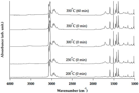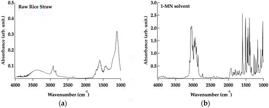 Figure 2a illustrates the broad spectrum of the raw RS obtained from the conventional KBr pellet. The O–H stretching region (3600–3100 cm−1), the C–H stretching region (3000–2800 cm−1) and the C–O, C–OH, and C–O–C stretching bands of cellulose (1100–1000 cm−1) were identified and assigned based on published data []. The spectrum for 1-MN, shown in Figure 2b, exhibited the aromatic C–H stretching band at 3047 cm−1, the aliphatic C–H stretching band at 2980–2870 cm−1, as well as a weak band at 3009 cm−1. The spectrum also displayed the C–C–H in-plane ring bending region (1300–100 cm−1) and the C–H in-plane bending vibration region (1420–1128 cm−1). The spectra of the Solvent-soluble obtained at each batch extraction are shown in Figure 3. The figure shows the IR spectra of the Solvent-soluble of RS prepared at 200, 250, 300, and 350 °C with residence time 0 min, and at 350 °C with residence time 60 min. The spectra characteristics are analogous to the spectrum of 1-MN. The Solvent-soluble spectra were different from those for the raw RS in that the Solvent-soluble spectra displayed weakened OH-stretching bands, more distinct bands for aromatic C–H stretching at 3050 cm−1, aliphatic C–H, C–H2, and C–H3 stretching at 2960–2850 cm−1, and C=O stretching at 1700 cm−1, as well as other peaks associated with bond deformation at 1500–1000 cm−1 []. The oxygen-containing region (1800–1500 cm−1) increased with the solvent treatment temperature from 200 to 300 °C, and decreased when the treatment temperature changed from 300 to 350 °C. The peak related to the C–H band of the Solvent-soluble displayed significant overlap between the different samples due to the strong C–H band for 1-MN. In order to overcome this interference of the background sample, the quantitative analysis in this study was performed for the absorbance region in between 3600 and 3100 cm−1 for the oxygen–hydrogen (-OH) stretching region, and 1800 and 1500 cm−1 for the oxygen-containing region.