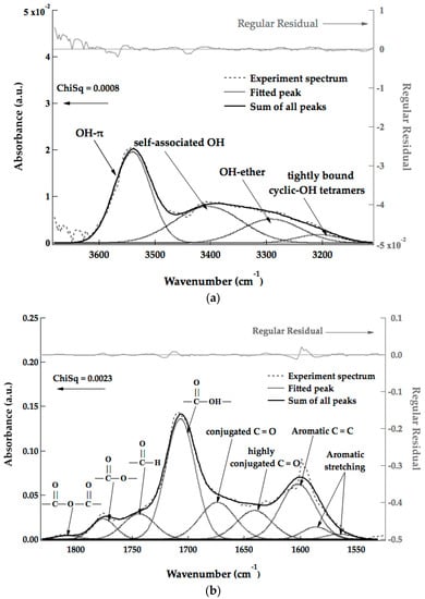 Figure 4a shows the OH bands in the OH-stretching region (3650–3100 cm−1). The wide band centered at around 3400 cm−1 was attributed to the hydrogen bonding of the self-associated OH n-mers and the distinct peak at 3540 cm−1 was attributed to OH- hydrogen bonding. The other two hydrogen bonds identified in the spectra were for the OH–ether O functional group and for the tightly bound cyclic-OH tetramers at 3280 and 3170 cm−1, respectively. Curve-fitting was successfully used to identify peaks in the oxygen-containing region from 1850 to 1500 cm−1. Figure 4b shows the bands for the nine oxygenic functional groups identified in this region. The strongest absorption band (1710 cm−1) was attributed to carboxyl groups (-COOH), while shoulder bands at 1800, 1770, and 1740 cm−1 were assigned to anhydrides (-COOCO), esters (-COO), and aldehydes (-COH), respectively. Weak bands relative to the carboxyl groups at 1670 and 1650 cm−1 were attributed to conjugated carbonyl structure groups (-C(O)2O). The band at 1607 cm−1 was attributed to aromatic C=C bonds, while the peaks at 1580 and 1560 cm−1 were associated with aromatic stretching bands.