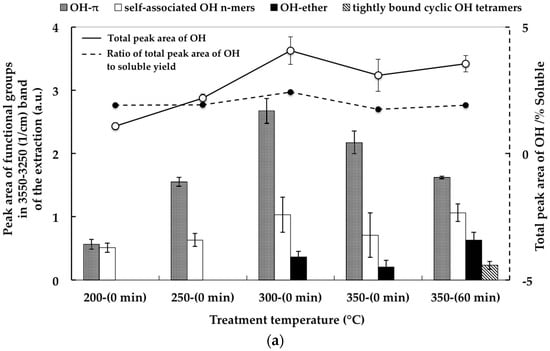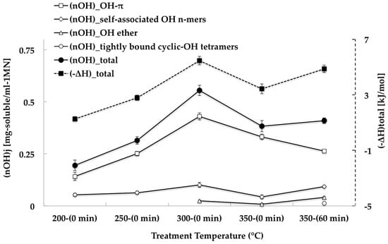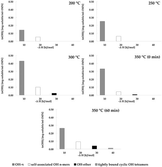 Figure 6 shows the estimated amount and strength of the OH-associated hydrogen bonds at each treatment temperature. The number of hydroxyl groups for each hydrogen bond, (nOH,j), was estimated from each peak area, , and the OH wavenumber shift, , using Equation (1). The strength of each hydrogen bond was interpreted from the relationship between the enthalpy change, H, and as shown in Equation (4). In terms of the estimated bond strength, the cyclic-OH was identified as the strongest of the four types of hydrogen bonds, followed by OH–ether, the self-associated OH n-mers, and finally OH-, which had the weakest estimated bond strength. Only the weaker of the hydrogen bonds (OH- and the self-associated OH n-mers) were observed at treatment temperatures of 200 and 250 °C. OH–ether was observed starting at 300 °C, while the strongest of the four groups, cyclic-OH, was observed only at 350 °C during the prolonged residence time. This indicates that weaker hydrogen bonds were broken at lower treatment temperatures, while the breaking of stronger hydrogen bonding groups occurred only at increased treatment temperatures and times.