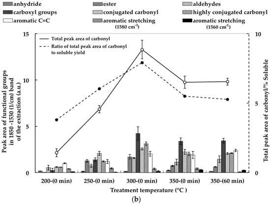 Wannapeera et al. previously reported on the generation of CO and CO2 in DSE from 300 to 350 °C []. The significant decreases in aldehydes, esters, conjugated carbonyls, and highly conjugated carbonyl groups between 300 and 350 °C not only signified the occurrence of deoxygenation, but also suggested the involvement of these groups in the release of CO and CO2. The significant reduction of the carboxylic groups from 300 to 350 °C (0 min) also suggested the occurrence of decarboxylation. The appearance of a distinct anhydride peak at 350 °C (0 min) suggests the occurrence of dehydration, as Miura et al. linked the observation of anhydrides to the decomposition of hydrogen bonds for COOH dimers in the hydroxyl region for coal with the formation of water [].